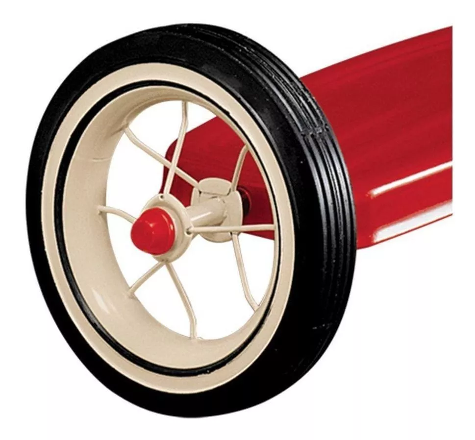 Estructura de acero, ruedas con radios y neumáticos de goma para mayor durabilidad.